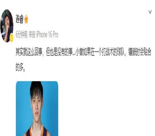 媒体人连睿点评了曾凡博和篮网队,连睿表示:其实就这么回事,但也是没有的事,小曾如果在一个打战术的球队,镶嵌时会贴合的多。