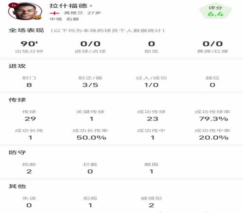 数据显示,拉什福德本场比赛出场90分钟,没有进球也没有助攻。