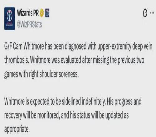 爆料王Shams:惠特摩尔确诊右肩上肢深静脉血栓,无限期休战......奇才官方已经确认了该消息。