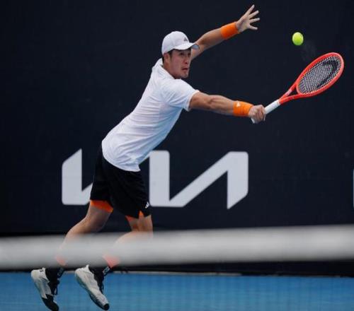 1月15日,吴易昺在澳网资格赛男单决胜轮回球。新华社发