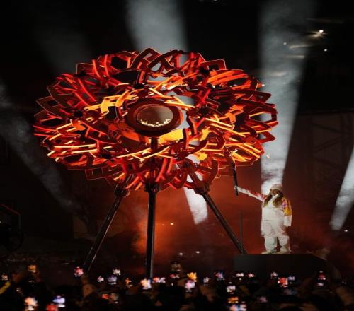 开幕式主会场圣西罗体育场大屏幕显示主火炬被点燃。