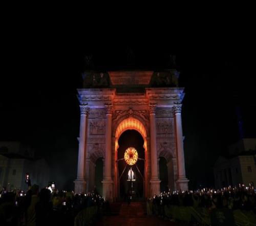 这是在米兰和平拱门拍摄的主火炬被点燃。