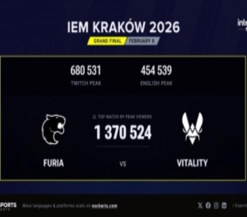 体育资讯2月9日称 根据Esports Charts网站的数据统计,IEM克拉科夫的最高收视人数为137万人,发生在Vitality对阵FURIA的总决赛中。这一数据超越了2025年的IEM卡托维兹(129万人)成为历史上收视率最高的非Major赛事,同时在历史收视率总榜中也能排名第8位!