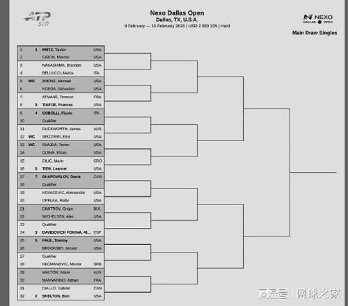 我们再来关注其它消息。北京时间昨天,本周的两站ATP巡回赛相继公布了正赛签表。ATP500美国达拉斯公开赛,两位本土名将弗里茨、谢尔顿位列前两号种子,卫冕冠军是加拿大名将沙波瓦洛夫。