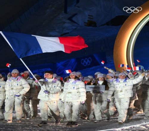 在一众大红大绿的国家队服中,法国队那一身冰雪奶油色的质感,直接把奥运入场式拉去了巴黎时装周的视听高度。