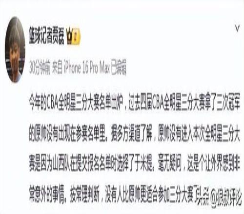 打听了一下,听说是山西队主动报名于米提顶替了他,于米提本赛季投的确实不错,但联赛中的三分命中率和场均贡献数据还没有赶上原帅,这样一来,等于是“剥夺了”原帅创造全明星历史的机会,这个操作,确实很诡异。