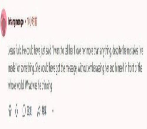 “我的天,他明明可以说‘我想告诉她,尽管我犯了错,但我爱她胜过一切’之类的话。这样她就能明白他的心意,又不必在全世界面前让彼此难堪了。他到底在想什么?”