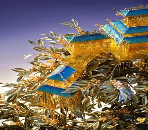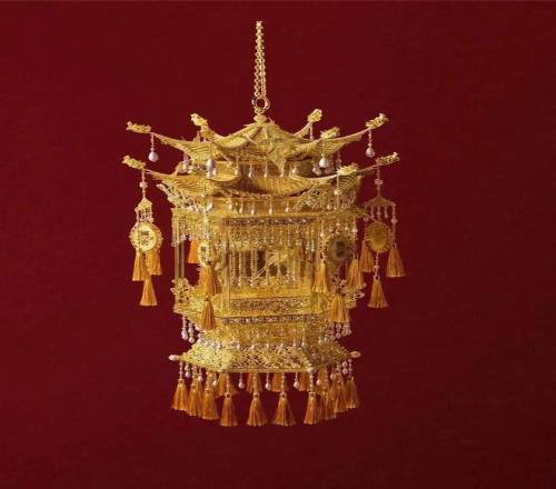 用到了中国传统的琉璃烧制、花丝镶嵌等等技艺制 作,一共1573颗宝石,40颗琉璃宝珠。