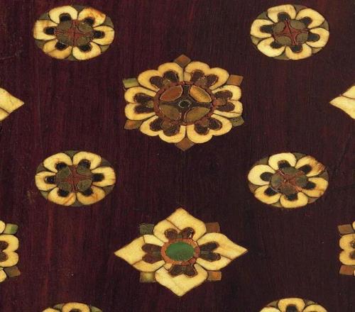 △日本正仓院收藏的一把唐朝时期的琵琶,就用到了细木镶嵌工艺,以紫檀木制作,用到了唐朝特别流行的宝相花纹。八卦一嘴:当年这件文物拿出来展出时,网上有很多人玩笑道:原来我们中国几百年前就有自己的LV老花了