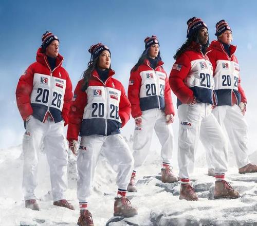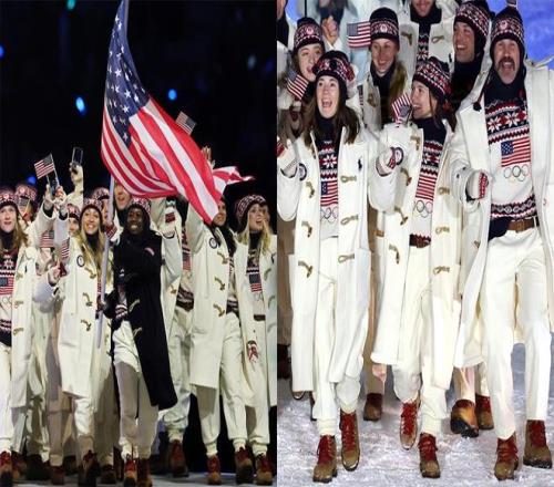 美国代表团这边开闭幕式服装由合作近 20 年的 Ralph Lauren 打造,延续品牌过去奥运会的玩法,开幕式服装偏正式一些,闭幕式服装则更体现运动感。前者以白色羊角扣大衣搭配高领毛衣和羊毛长裤,针织帽子、手套都采用了毛衣同款花纹装饰,鞋子则是搭配了一双配有红色鞋带的棕色麂皮登山靴,整体非常美式。