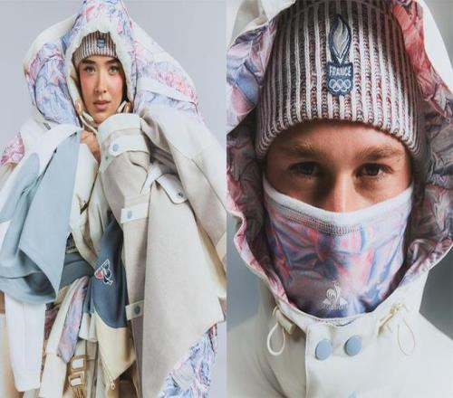 虽然运营不佳,但设计其实还是在线。这次为法国冬奥代表团打造的装备整体色调以奶白色为主,辅以雾霾蓝,主打纹样是对法国国旗三色元素的重新诠释,铺有红白蓝三色的织物揉皱后成为印花图案装点在服装和配饰的局部细节,干净又有视觉亮点。
