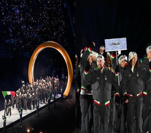 东道主意大利代表团的服装赞助商依旧是 EA7 Emporio Armani,双方合作始于 2012 年伦敦奥运会,也已经携手走过十多年。EA7 为开幕式打造的服装是一套灰色混纺羊毛斜纹布套装,外套是一件飞行员夹克,衣身下摆、袖口以及帽子内衬加入了意大利国旗的三色装饰,背后还有“Italia”字样。