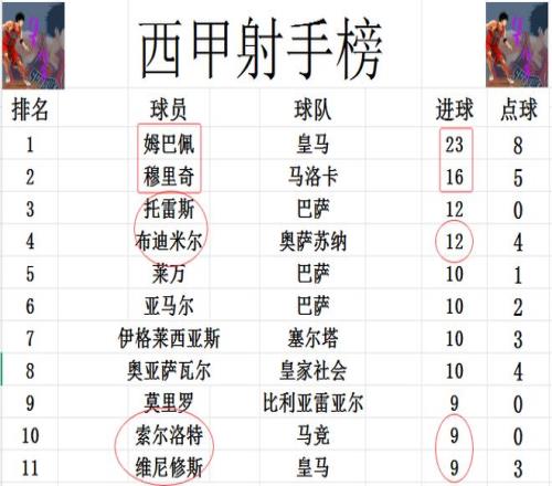 射手榜方面,姆巴佩破门被吹,今天未能进球,还是23球领跑,穆里奇16球排在第2。布迪米尔今天打入一粒点球后,追上托雷斯,两人12球并列第3。维尼修斯破门,索尔洛特双响,两人追上莫里罗,将前十门槛提高到9球。
