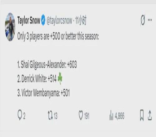 截至今天赛前,NBA联盟仅有3名球员赛季总正负值超过+500,他们分别是:1、亚历山大+603;2、德里克-怀特+514;3、文班亚马+501。不满500但超过400的有:霍姆格伦+490、坎宁安+484、尚帕尼+462、约基奇+437。