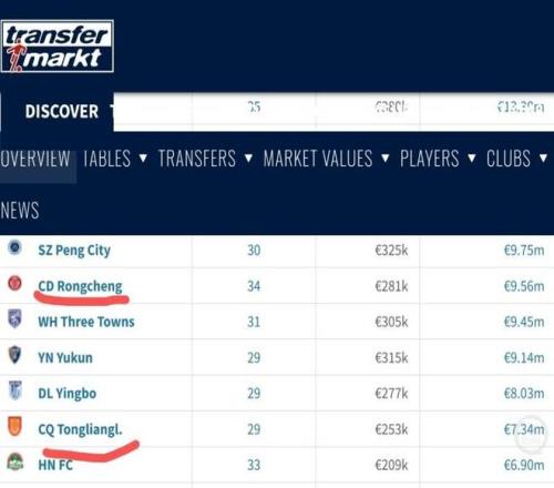 成都蓉城身价高于重庆铜梁龙。网页截屏图