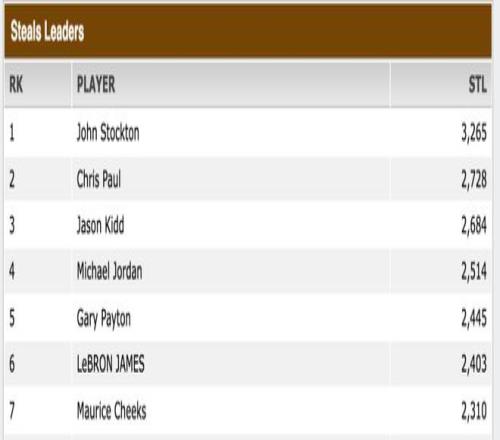 抢断:斯托克顿的纪录(3265次)遥不可及,保罗的第二名(2728次)和基德的第三名(2684次)也不太可能被超越。但目前排名第六的詹姆斯(2403次)下赛季有机会追上排名第五的加里·佩顿(2445次)和排名第四的迈克尔·乔丹(2514次)。