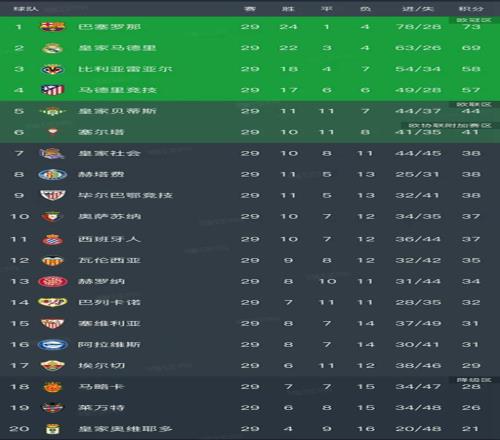 随着皇马32,巴萨10,西甲第29轮最新排名出炉!马竞下滑第4