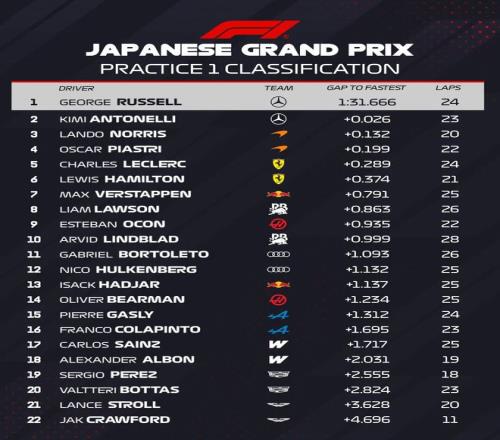 2026F1日本大奖赛今天中午结束了第一次练习赛,梅奔仍然强势,拉塞尔全场最快,安东内利P2;麦克拉伦的诺里斯与皮亚斯特里分列第三与第四,法拉利双雄勒克莱尔与汉密尔顿排在第五、第六。
