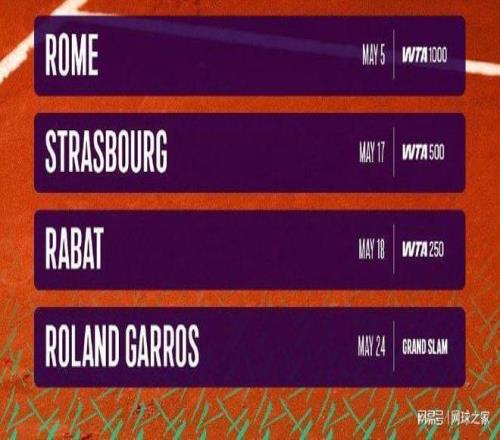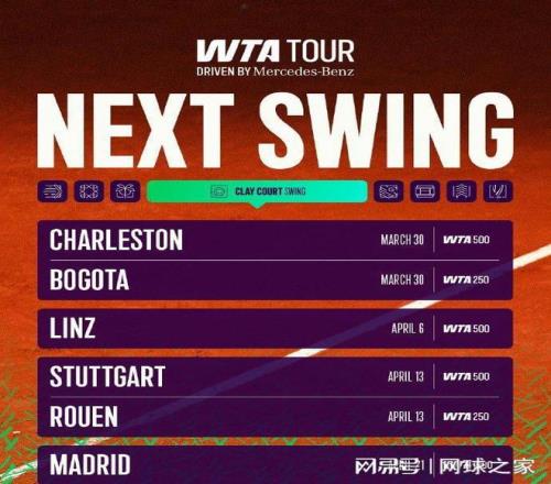 我们再来关注其它消息。北京时间昨晚,WTA官宣了今年红土赛季的赛历。这份赛历从3月底开始,一直到6月上旬,其中包括三站250赛、四站500赛和两站1000赛,最后是大满贯赛的法网。具体赛事安排,附图里有详细内容,球友可点击放大观看。