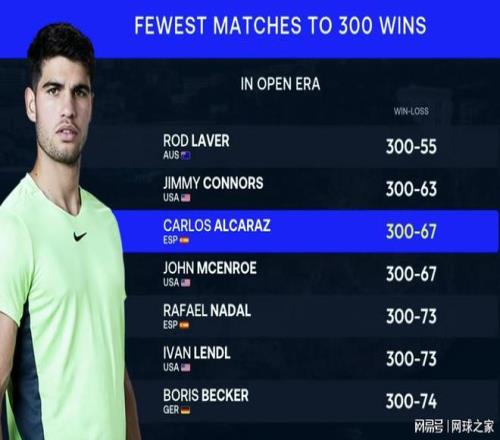 这场送蛋布勃利克的胜利,让阿尔卡拉斯成为所用场次第三少达成职业生涯300场单打胜利的男子球员。西班牙人以300胜67负同麦肯罗并列排在第三位,仅次于以300胜55负排在第一位的拉沃尔和以300胜63负位居第二位的康纳斯,跃在了同为300胜73负的伦德尔和纳达尔以及300胜74负的伦德尔前面。