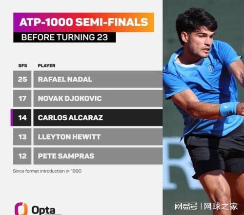 阿尔卡拉斯另一项了不起的新成就是,成为在23岁之前14次打进大师赛四强第三人,仅次于纳达尔(25)和德约(17),超过了休伊特(13)和桑普拉斯(12)。