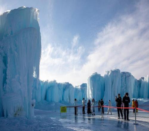 2026年1月2日,新疆博尔塔拉蒙古自治州,赛里木湖蓝冰冰瀑吸引游客。视觉中国 图