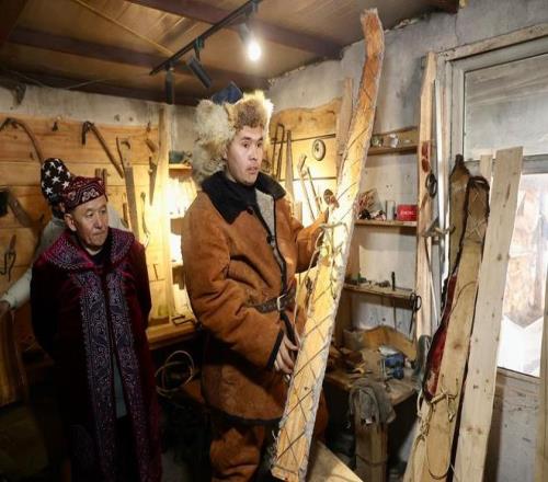 新疆阿勒泰,拉斯特乡斯兰别克古老毛皮滑雪板制作坊,第五代传承人胡安什别克·斯兰别克(右)展示制作完成的古毛皮滑雪板。视觉中国 图