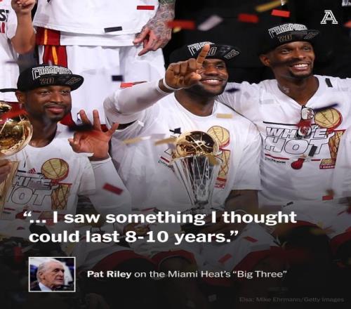 尽管詹姆斯承认莱利在自己职业生涯中意义重大,但他也表示,真正影响自己成长的其实是整个热火组织。“我觉得不只是帕特一个人,实际上是整个热火队的体系。”詹姆斯说道,“我去那里只有一个目标和一个想法,就是赢得总冠军。我觉得这是我在第一次效力骑士时没办法做到的,我已经努力过了,但当时就是感觉这件事是不可能的。所以我需要找到自己的道路,去完成一些目标。”