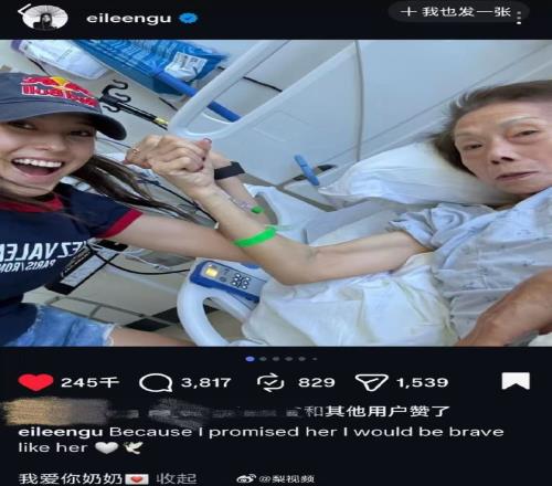 2月23日凌晨,谷爱凌在社媒晒出和外婆的照片,配文:“我承诺过要像你一样的勇敢,我爱你奶奶。”