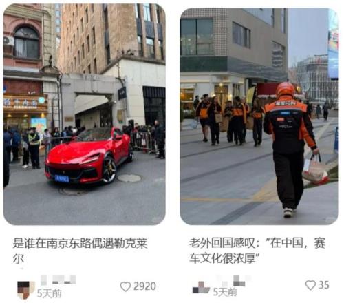 赛场之外,F1的影响力也漫溢在上海。F1车队工作人员在开市客采购的画面被超市员工拍下来,作为“开市客大牌有保障”的佐证;法拉利车手勒克莱尔和妻子逛豫园时被上海大爷拦下摆pose;淘宝闪购外卖员和迈凯伦车队的工作人员穿着同款橙黑外套在街头迎面相遇,“外国人回去感慨中国赛车文化氛围十分浓厚”;在餐厅吃饭、逛优衣库,都能偶遇一两个赛车手。