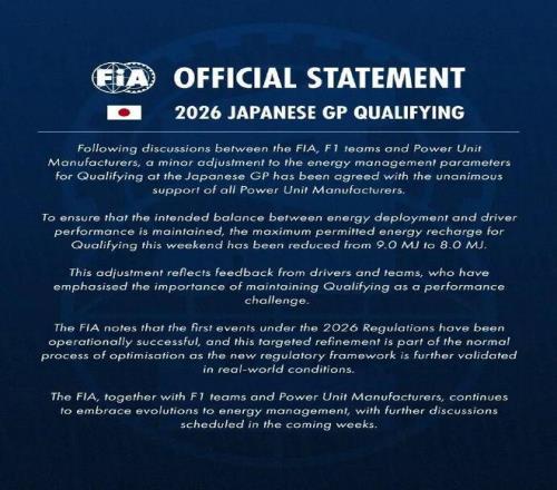 需要注意的是,本次调整仅限于排位赛,声明中明确表示“for Qualifying this weekend”。正赛的能量管理参数并未变动。这意味着,在周日正赛中,各动力单元制造商原有的能量管理策略仍然维持。排位赛的微调不会直接改变正赛的长距离能量分配格局。但排位赛名次的变化——如果本次调整导致某些车队的排位赛成绩发生相对位移——将间接影响正赛的发车顺位和策略选择。