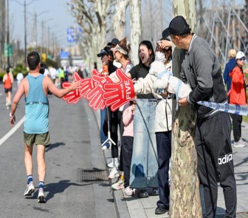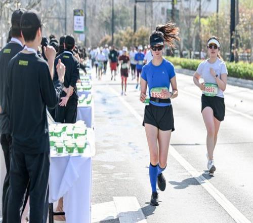3月28日,上海,赛道沿途设置了各式补给站,自5公里起,每5公里设置饮水饮料站,自7.5公里起,每5公里设置饮水用水站,全程共设置2个能量补给站。澎湃新闻记者 朱伟辉 图