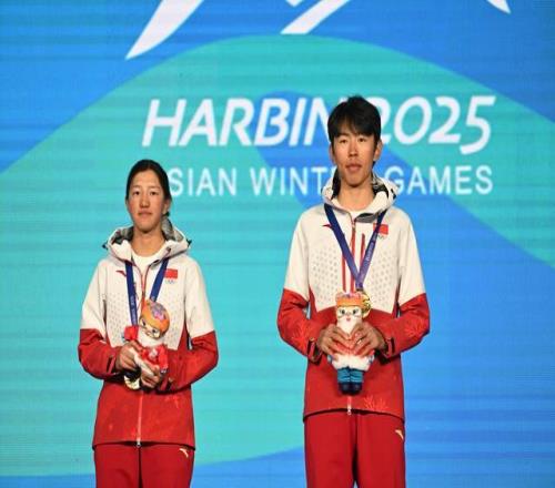 次旦玉珍和队友布鲁尔夺得2025哈尔滨亚冬会滑雪登山混合接力金牌。