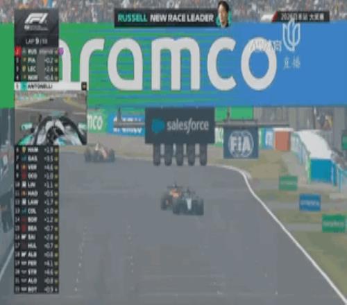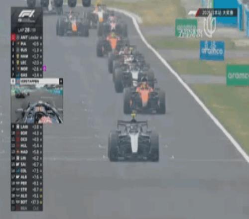 第3圈,拉塞尔在直道超越诺里斯来到第3,随后在第4圈利用超车模式超越勒克莱尔来到第2!而在车阵中游,维斯塔潘超越哈贾尔之后,将自己的队友甩给了身后紧咬的奥康,后者在第3圈于直道上直接完成了对哈贾尔的超越!