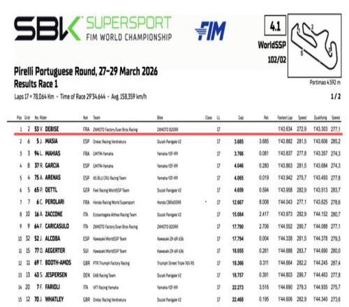 波尔蒂芒赛道的周日午后,历史被重新书写。WSBK世界超级摩托车锦标赛Supersport组别葡萄牙站第一回合正赛落下帷幕,张雪机车厂队车手瓦伦丁·德比斯驾驶着ZXMOTO 820RR-RS赛车历经十七圈鏖战,最终以3.685秒的优势率先冲线。这不仅是他个人职业生涯的高光时刻,更标志着中国制造商在世界顶级公路摩托车赛事中实现了零的突破——自WorldSSP创立以来,冠军榜上首次出现了来自中国的厂牌。