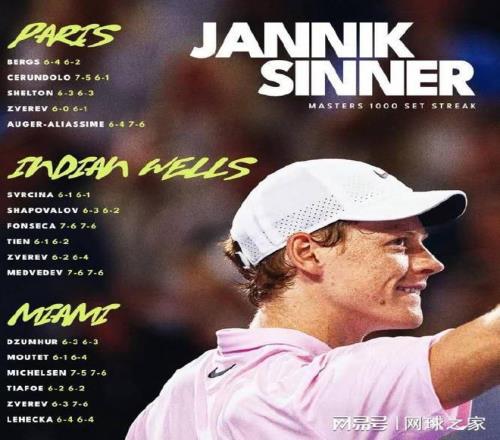 辛纳刚刚跨赛季连夺巴黎、印第安维尔斯和迈阿密三站大师赛冠军,位居ATP1990年设立大师赛以来历史第二,仅次于西班牙战神纳达尔、塞尔维亚天王德约科维奇曾经创造的大师赛四连冠。更加令人叹为观止的是,辛纳创造了跨赛季大师赛34盘连胜的新纪录,成为ATP1990年设立大师赛以来历史第一人,远超历史第二人德约科维奇曾经创造的大师赛24盘连胜。