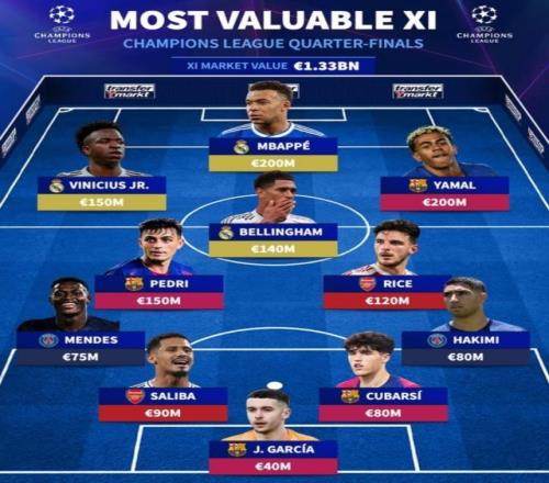 德转列欧冠八强战最贵阵:姆巴佩、亚马尔领衔,皇马3将、巴萨4人
