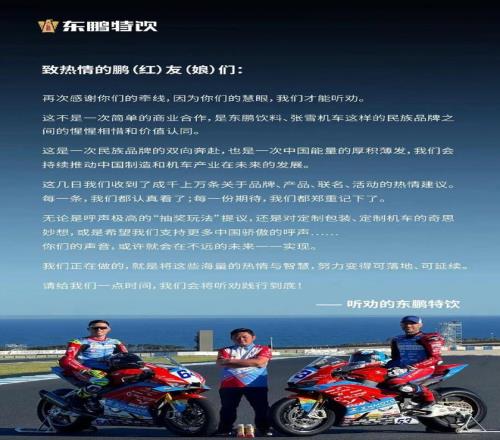 去年11月,张雪公开招募赞助商,却几乎无人问津。评论区里,网友纷纷点名东鹏特饮。东鹏特饮快速反应,两个月后正式签约,成为张雪机车唯一一家饮料赞助方。