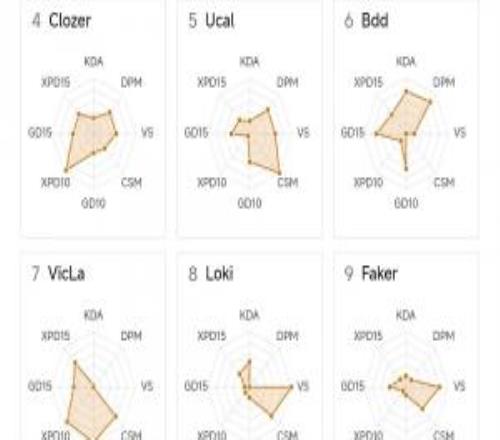 体育资讯4月11日称 近日,有国外粉丝制作了4月10日前LCK联赛的选手数据雷达图,其中Chovy虽然开幕输给KT但后续重新成为“联赛超”;Zeka以及Scout两位冠军中单的状态也开始回暖;而Faker虽然位列第九但数据还算能看,相比之下ShowMakers的数据则略显幽默!
