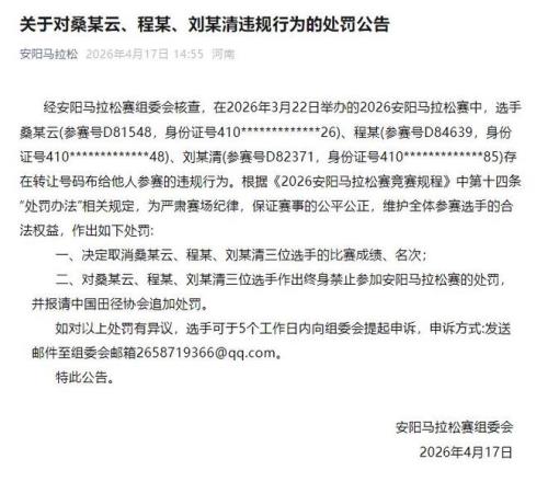 新京报讯 4月17日,河南安阳马拉松赛组委会发布处罚公告:经安阳马拉松赛组委会核查,在2026年3月22日举办的2026安阳马拉松赛中,选手桑某云(参赛号D81548,身份证号410*************26)、程某(参赛号D84639,身份证号410*************48)、刘某清(参赛号D82371,身份证号410*************85)存在转让号码布给他人参赛的违规行为。根据《2026安阳马拉松赛竞赛规程》中第十四条“处罚办法”相关规定,为严肃赛场纪律,保证赛事的公平公正,维护全体参赛选手的合法权益,作出如下处罚: