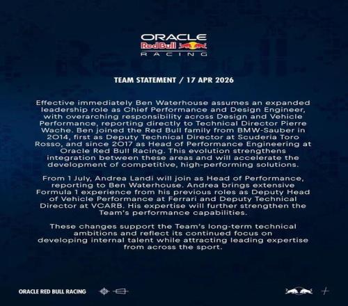 与此同时,曾担任法拉利车辆性能副主管的安德烈亚·兰迪将于2026年7月1日起正式加盟红牛车队,担任性能主管,直接向沃特豪斯汇报。