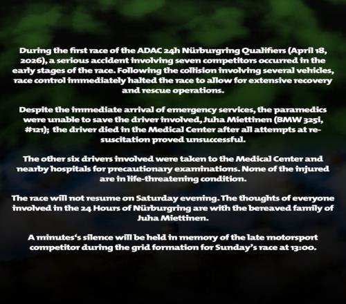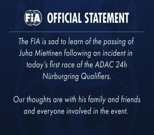 从2018年开始,Juha Miettinen在纽博格林赛事中登上了25次领奖台,并斩获5次冠军。国际汽联通过官方社交媒体,向这位优秀车手的离世表示哀悼:“FIA刚刚得知Juha Miettinen在今天纽博格林24小时耐力赛首场比赛中因事故不幸去世的消息,感到非常难过。我们和他的家人、朋友,以及所有参与这次比赛的人一起,深感悲痛。”