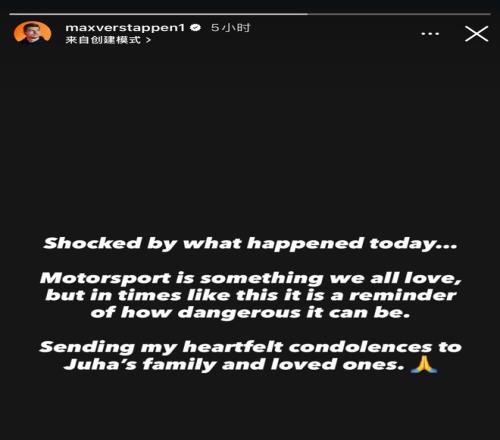 四届F1世界冠军维斯塔潘也参与了本站赛事,万幸的是事故发生时,他还没有登场。此后,维斯塔潘也通过社媒向Juha Miettinen的家人和朋友表达了深切的慰问。