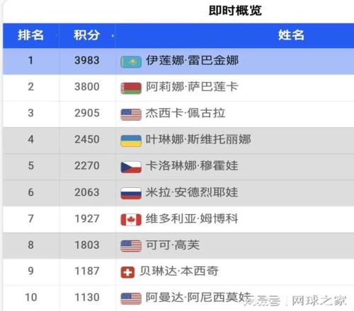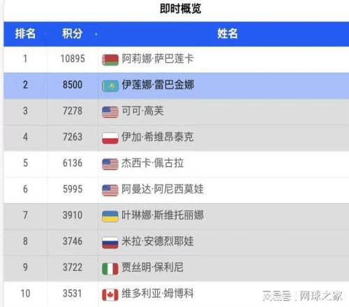 然而,世界排名榜上的情况却是另一番景象。尽管莱巴金娜稳坐世界第二,但与排名榜首的萨巴伦卡之间,仍然隔着2395分的巨大差距。这个数字是什么概念?相当于一个大满贯冠军加一站500赛冠军的积分总和。