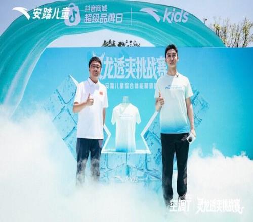 奥运冠军武大靖以"安踏儿童成长大使"的身份再次到场,这已是他见证空调T产品升级的第二年。发布仪式上,武大靖与安踏儿童品牌市场总监初帅共同挥锤击碎模拟冰块装置,搭载A-ICETECH冰感科技的安踏儿童空调T正式亮相。