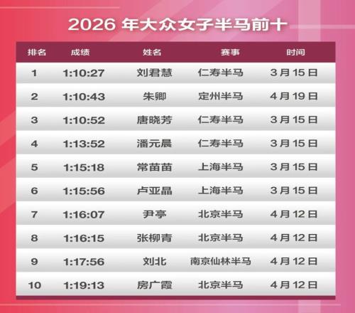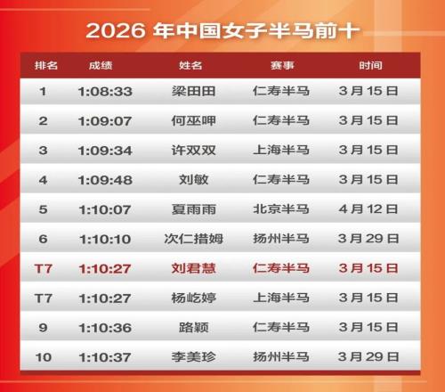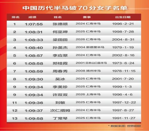 一个月前的3月15日,在最易PB的赛道仁寿半马两位大众女选手刘君慧和唐晓芳首次跑到70分,率先吹响向Sub70冲击的号角。根据世界田联的数据,中国女子半马Sub70俱乐部的成员仅13人,其中10个成绩都出自2024年之后,且9个出自仁寿半马。在今年的仁寿,中国一姐张德顺因为婚礼过后杂事缠身,错失了向自己保持的半马1:07:55中国最好成绩冲击的机会,只跑出了1:14:17,但全运会双金王梁田田在自己第二年的仁寿交出1:08:33的PB,排在了2026年度中国女子半马榜首。