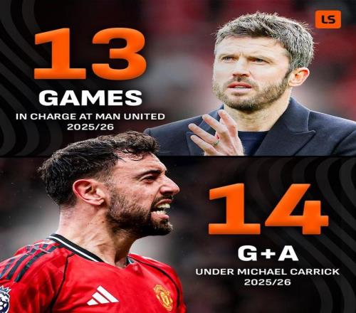 英超第34轮,曼联主场2-1击败布伦特福德,布鲁诺-费尔南德斯送出一次助攻,至此,在卡里克治下,布鲁诺-费尔南德斯本赛季13场已参与14球。